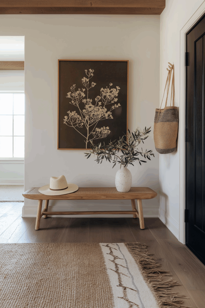 - Open-weave accents like jute poufs, rattan pendants, or handwoven baskets