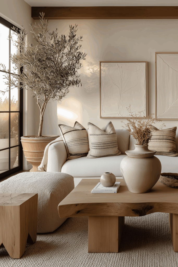 Woven textures, sculptural wood pieces, and handmade ceramics mix effortlessly with soft textiles, global accents, and a curated sense of individuality. It’s all about embracing imperfection, celebrating texture, and letting your space breathe with intention and personality. This look doesn’t follow strict rules; it flows with freedom, warmth, and subtle sophistication.