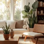 Layer planters in gentle, asymmetrical groupings; perhaps a sculptural clay pot beside a moss-filled bowl, or a single snake plant rising from a low pedestal. These imperfect pairings create the visual rhythm so beloved in wabi-sabi design.