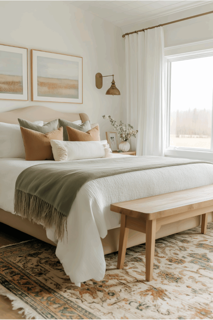 With its sunlit palette, layered linen textures, and soft sage and terracotta accents, this space captures the essence of earthy bedroom design at its most serene. The warm tones of the throw pillows echo the natural beauty found in the framed wall art, while the vintage-style rug adds grounding detail without overwhelming the room.