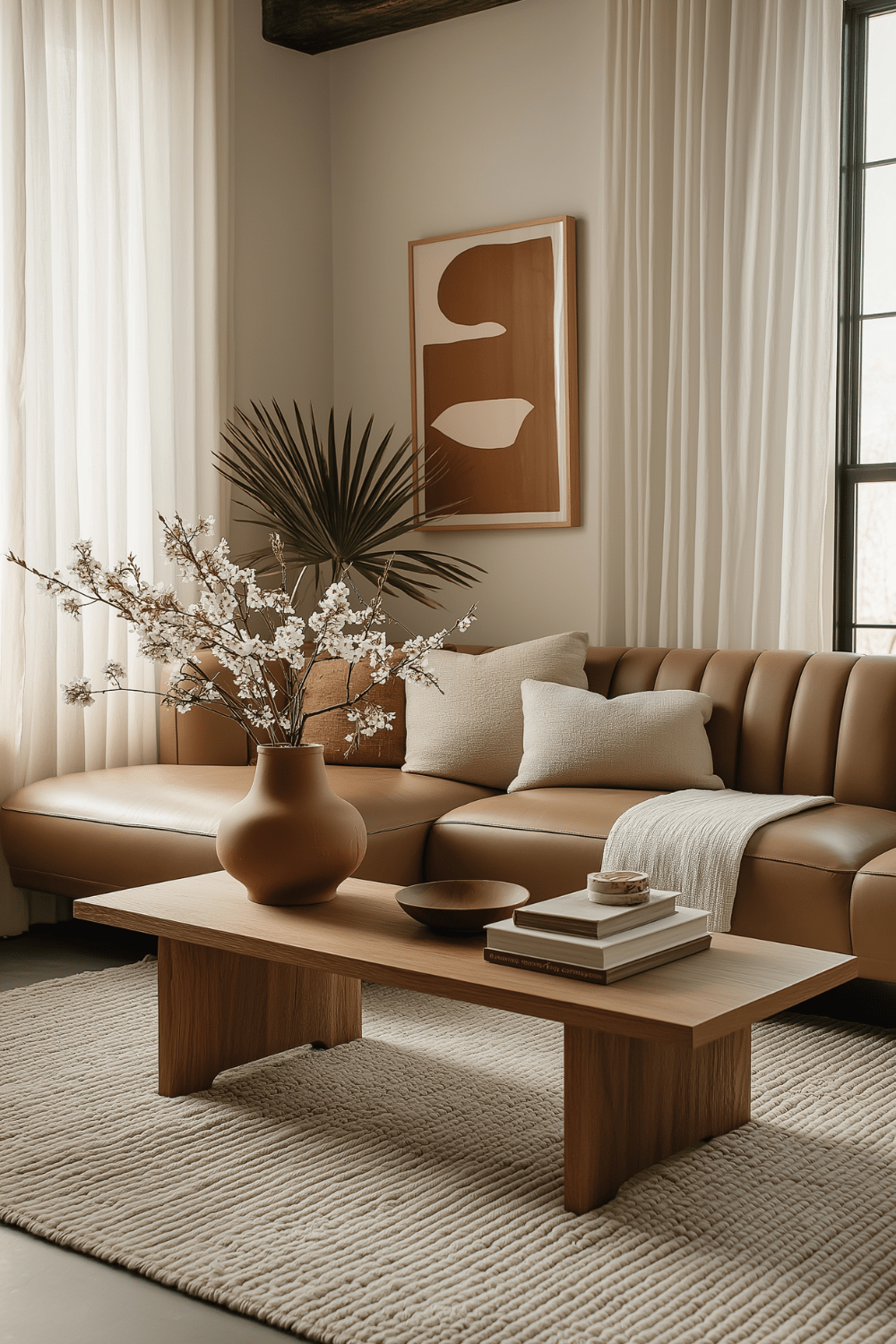 For furniture, look for pieces upholstered in warm neutrals or earthy fabrics like boucle, linen, or velvet. Layer your bed or sofa with bedding, throws, and pillows in shades like sand, camel, or soft terracotta to add dimension and coziness.
