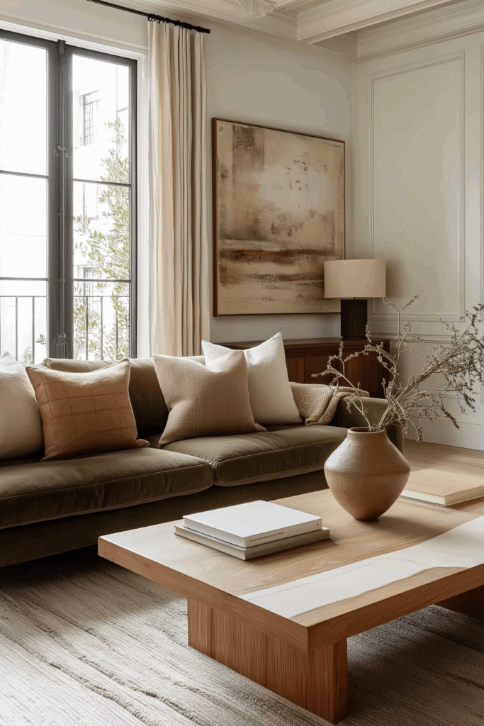 Consider pairing creamy beige with soft ochre for a look that feels sunlit and warm, or mix mushroom grey with deep olive for a palette that’s moody yet grounded. Warm neutrals like camel, taupe, and sandy browns can be layered together to create subtle shifts in tone that keep a room feeling dynamic and cozy.