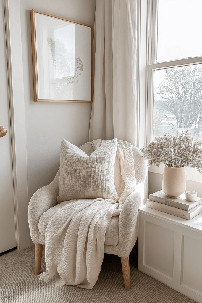 - A reading chair positioned to invite pause and comfort
