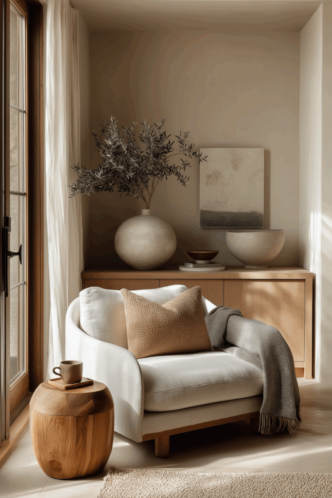 Layer in organic accents: a smooth stone bowl for collected treasures, a rustic wooden stool for your tea, or a woven basket to hold a soft throw. Position plants where they’re easy to water and where you’ll naturally notice them throughout the day, letting their slow growth remind you to breathe and take things one moment at a time.