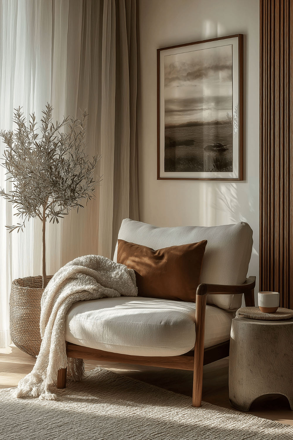 Nothing restores calm quite like nature’s quiet presence. Add greenery that thrives indoors: an airy olive tree, graceful parlor palm, or a trailing pothos spilling from a shelf.