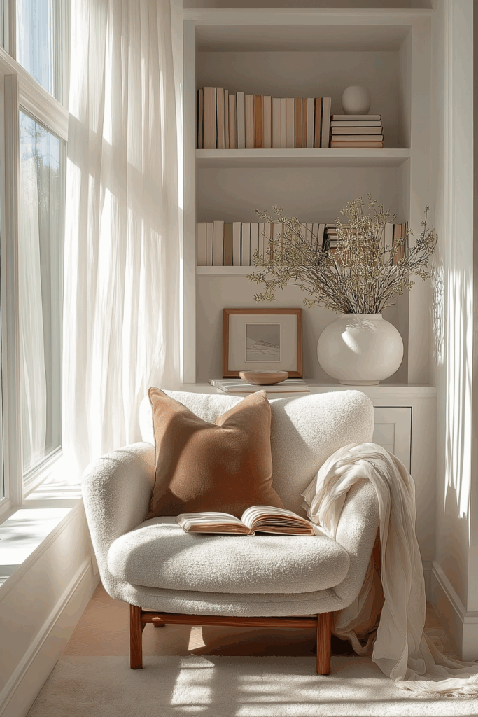 - Lighting: Use a warm table lamp, softly glowing paper lantern, or a dimmer switch to create a cocoon-like atmosphere.
