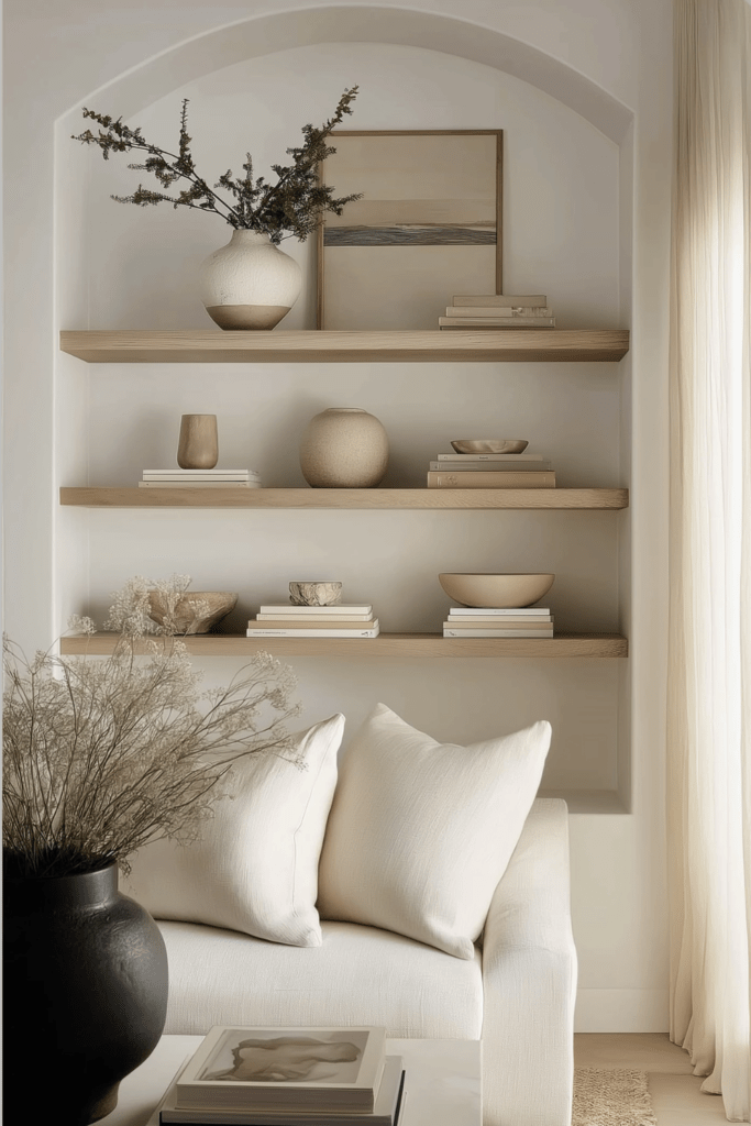 Style note: Shelves do not need to be fully decorated to feel complete. A few meaningful objects placed with intention often create a more relaxed and elegant look than a shelf filled with decor.