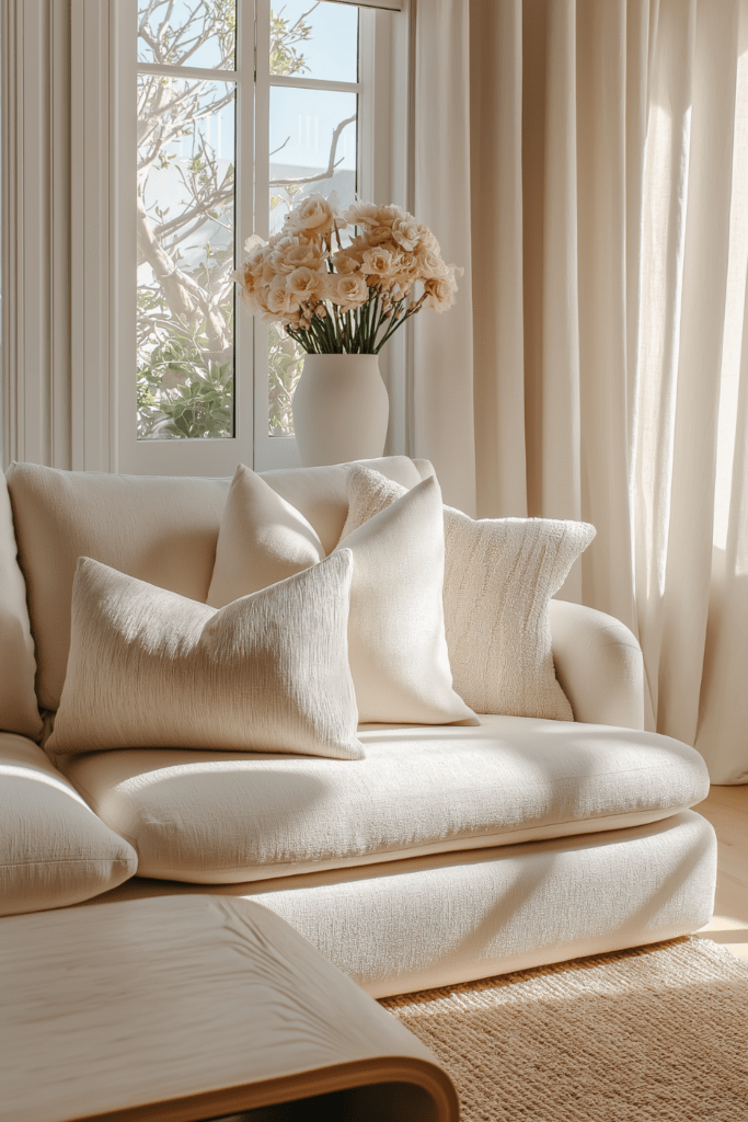 Neutral tones such as cream, sand, and warm ivory help keep the palette soft and balanced. Instead of relying on bold patterns, layering pillows with subtle texture creates depth while preserving the peaceful atmosphere often seen in organic modern living room ideas. The result is a sofa that feels styled yet effortless.