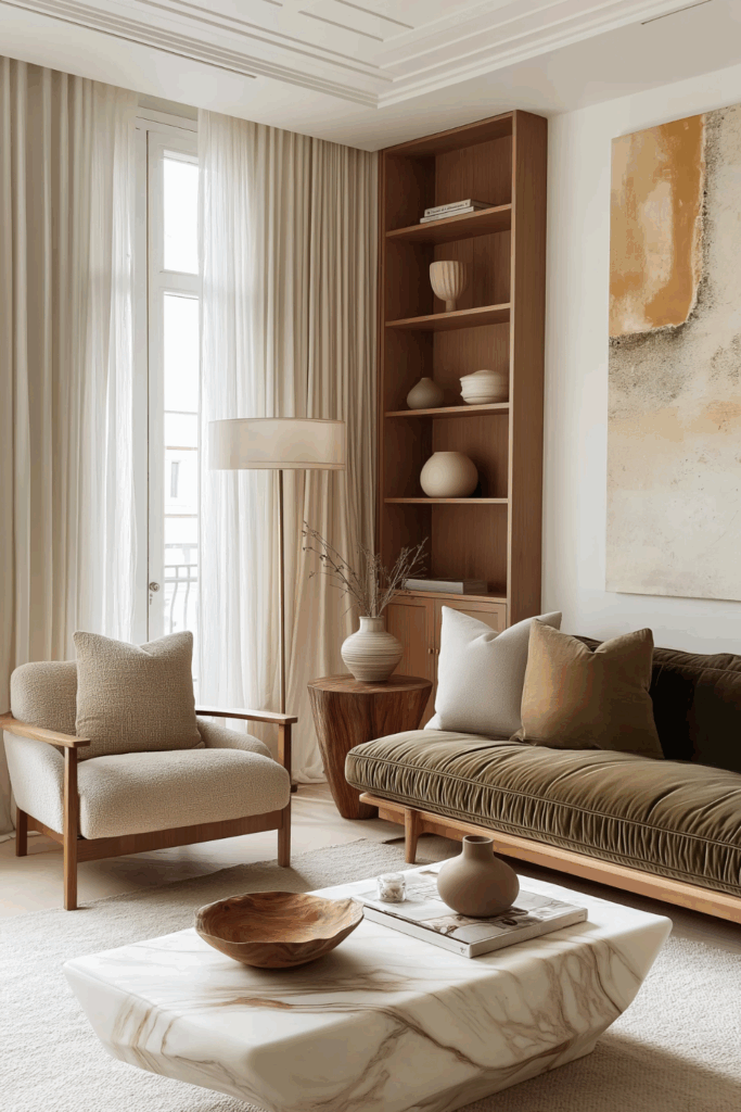 - Stone adds grounding energy and an architectural edge. A travertine coffee table beneath a wooden beam ceiling, or a marble-topped console paired with raw wood legs, creates a refined yet grounded look.