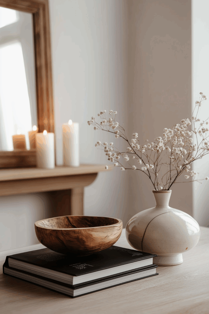 Think sculpted wood bowls that rest effortlessly on your coffee table, artisan candle holders that glow with soft light, or a raw wood-framed mirror that adds organic charm above your dresser. Even wall hooks or trays crafted from reclaimed wood can become functional art pieces when thoughtfully placed.