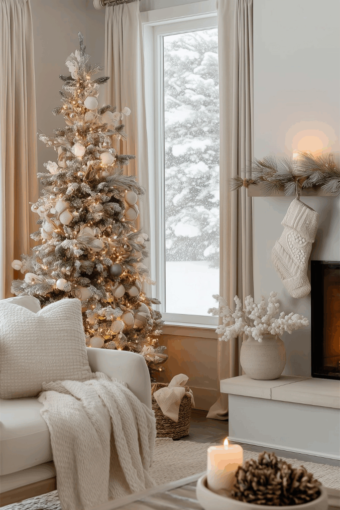 Texture is your best friend here. Keep a cozy throw blanket draped near the tree, add a small bowl of pinecones or natural ornaments on a nearby surface, or hang wool or linen stockings in soft winter tones. These tactile accents echo the cozy neutral Christmas decor found throughout your tree.