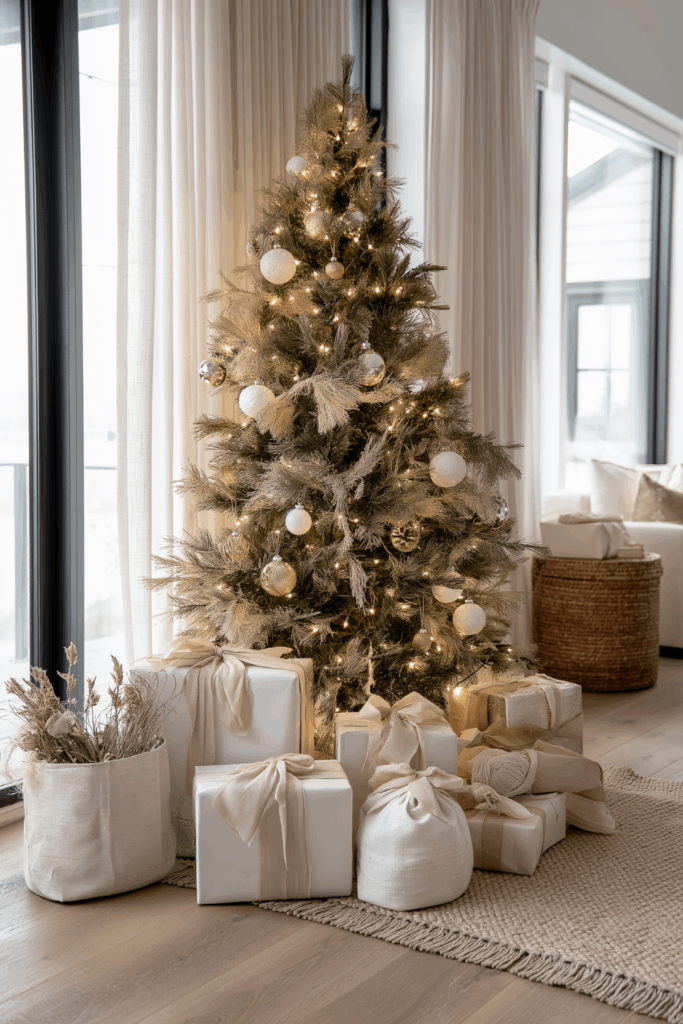 Stick to soft, natural materials that feel warm, understated, and timeless. The goal is harmony, not clutter. When your wrapping palette flows with your tree, the entire scene feels serene and incredibly elevated.