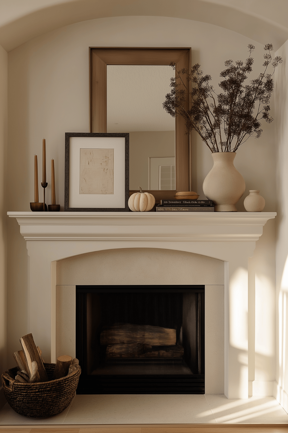 Nothing sets the mood of a mantel quite like lighting. By adding taper candles, pillar candles, or lanterns in muted holders, you can instantly create an atmosphere that feels both intimate and timeless. The warm flicker of candlelight against natural textures enhances the calm mood of cozy neutral fireplace decor, making your mantel the focal point of the room on crisp autumn evenings.