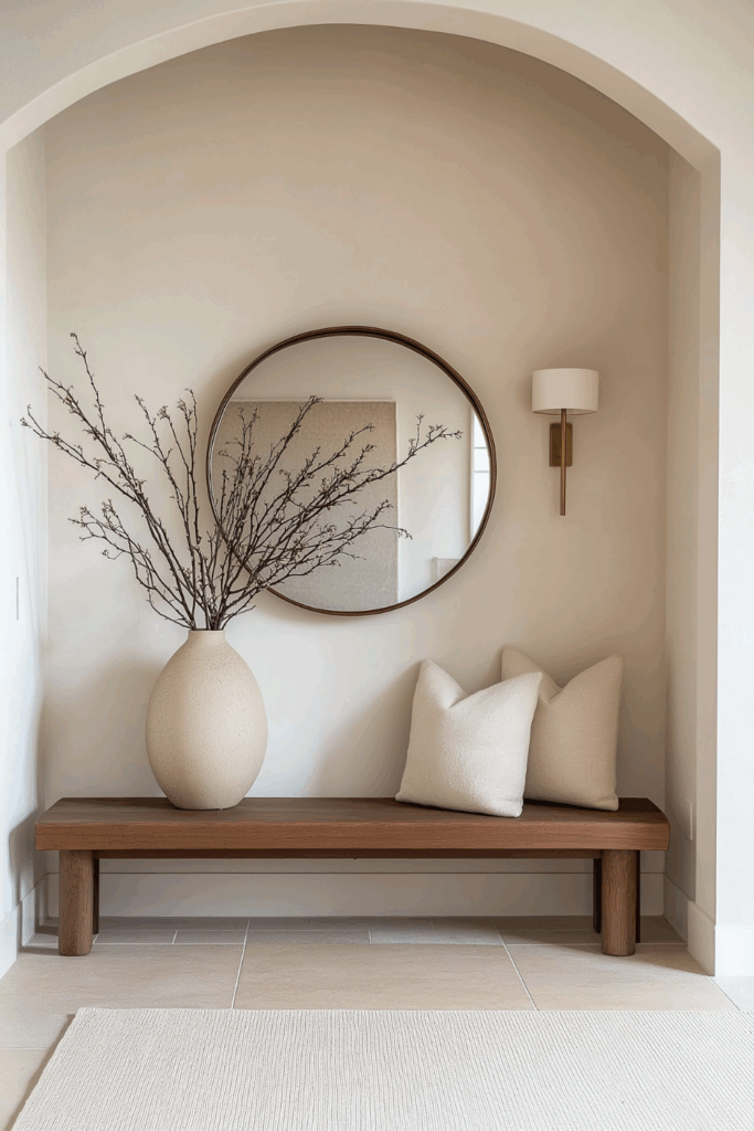 First impressions matter, and this entryway speaks volumes. Honed limestone flooring leads to a floating wood bench, with a sculptural vase of wild branches drawing the eye upward. The space breathes. Clean lines guide movement effortlessly, and thoughtful touches, such as a round mirror and a warm wall sconce, reflect the balance of nature and function. It’s not just a passageway; it’s an invitation to slow down and arrive.