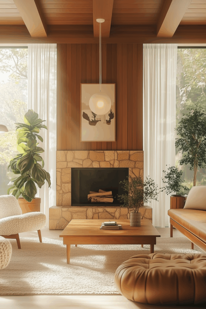 Imagine stepping into a warm, light-filled space grounded by a handcrafted stone fireplace; the kind that commands the room without overpowering it. The furnishings are low-slung and sculptural, with a neutral palette that lets the textures do the talking. Think boucle accent chairs, a raw wood coffee table, and linen drapery that dances with the breeze from wide-open windows. Potted trees and leafy greenery echo the forest just outside, creating a seamless extension of the natural world indoors.