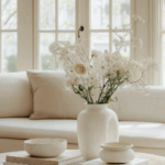 If you prefer flowers, go for seasonal blooms in muted tones to complement the Organic Modern aesthetic. A small bouquet of white or pale pink roses in a matte vase can add a delicate and refined touch.