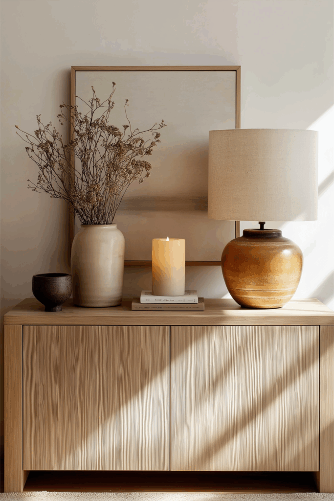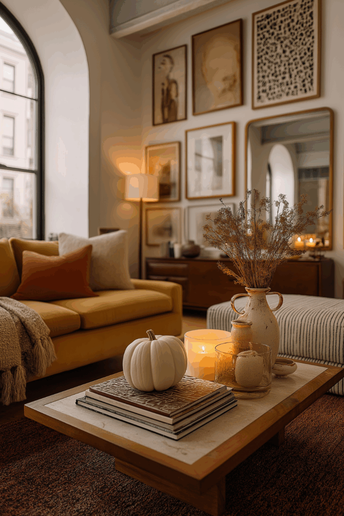 Tip: Style in clusters of three (like a vase, a candle, and a small pumpkin) to create interest without clutter.
