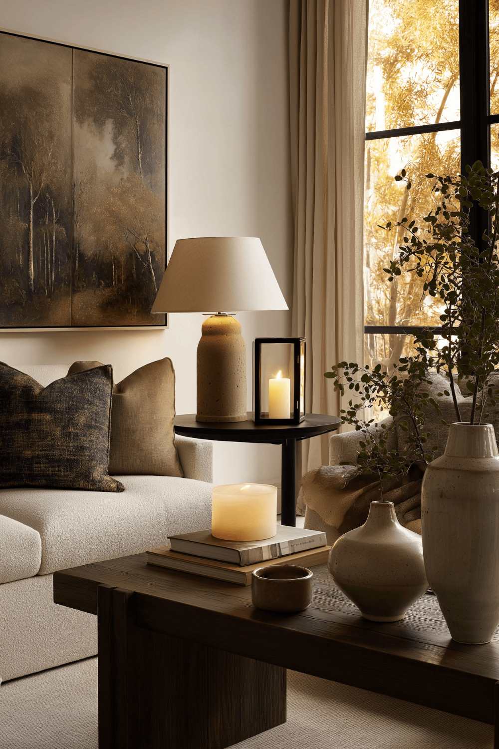 Creating depth with lighting is about more than brightness. In an organic modern space, mixing light sources at different heights and finishes can completely transform a room. By combining table lamps, wall sconces, pendant lights, and candles, you can create golden fall lighting accents that feel dynamic yet cozy. The effect enhances textures, highlights your favorite décor pieces, and creates a welcoming glow that feels luxurious and grounded.