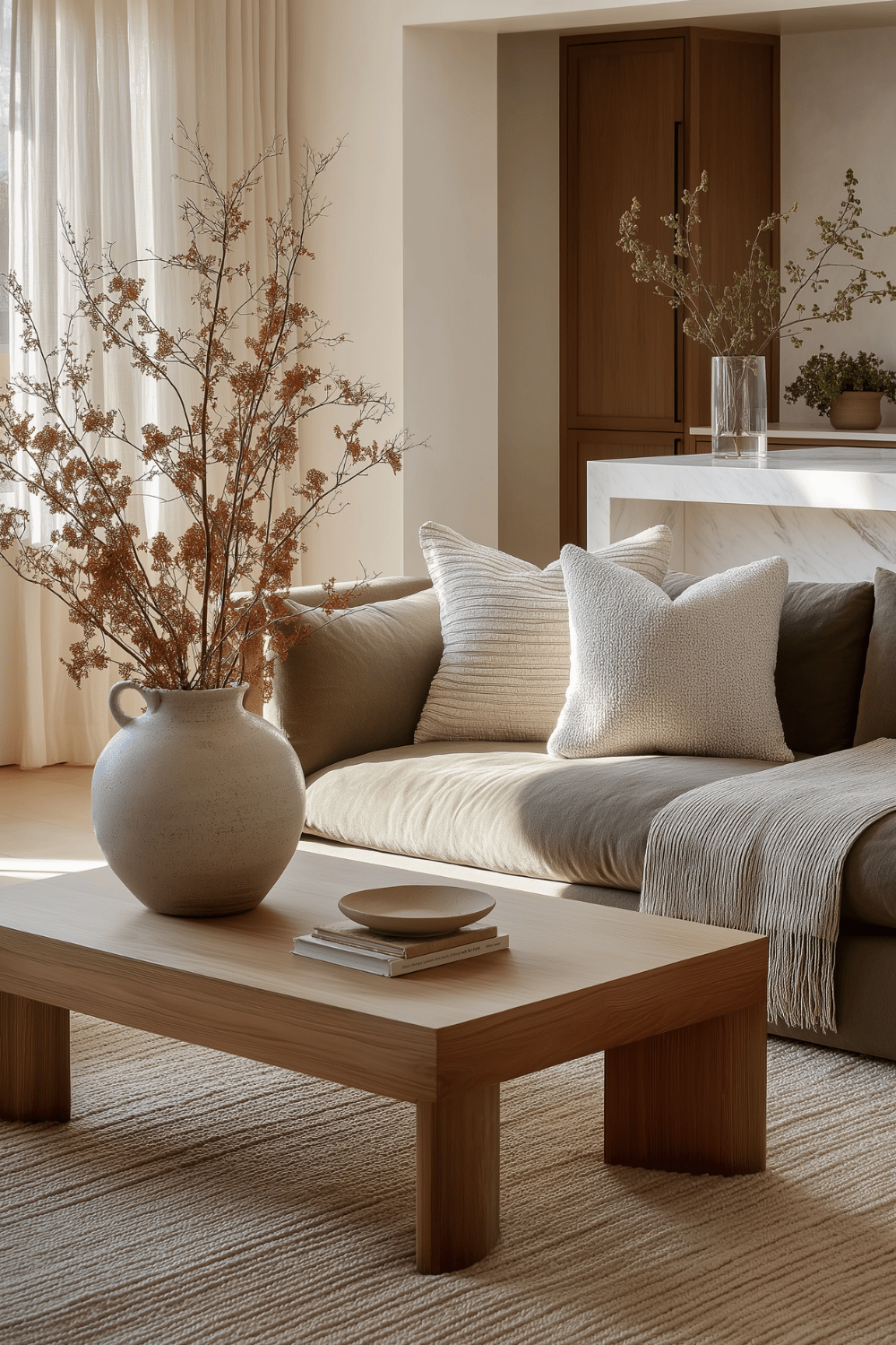 The key is layering without clutter. A wool throw on a wooden bench, linen pillows beside a ceramic vase, or a jute rug under a stone coffee table all speak to the art of thoughtful design. These combinations bring texture and warmth while maintaining the clean, uncluttered essence of the style.