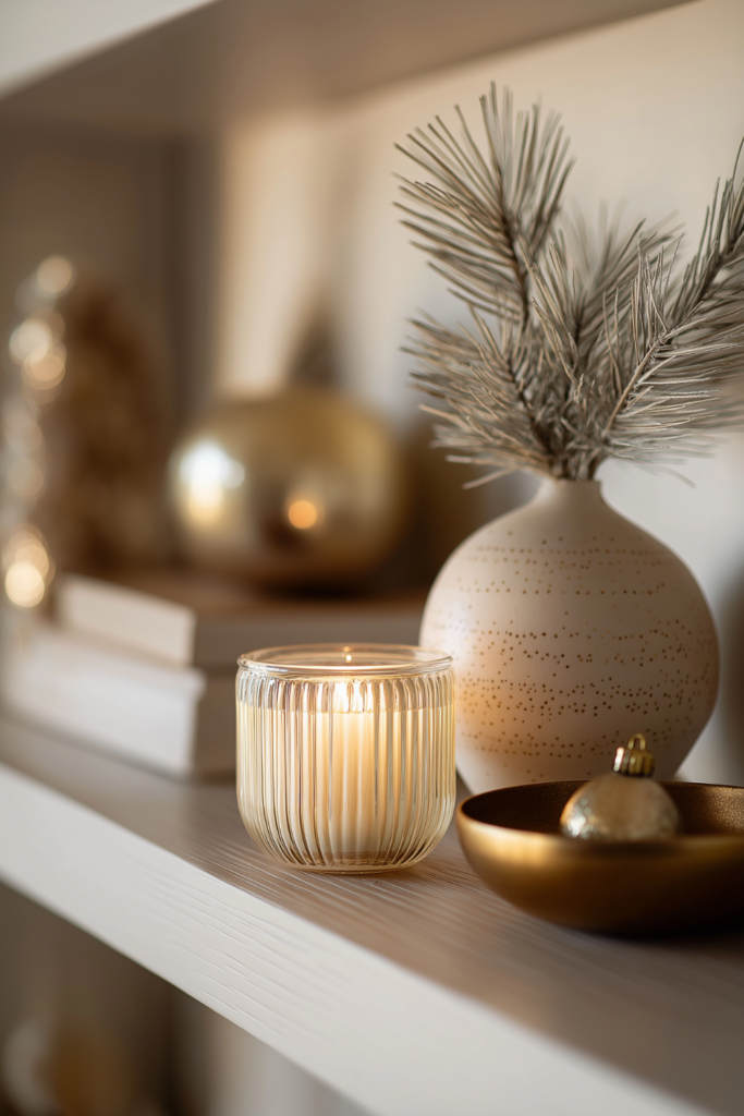 - Choose subtle metallics that support holiday shelf styling without distraction