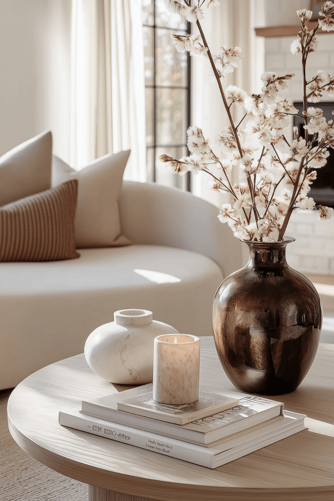 Because coffee tables naturally sit at the center of a space, even a small arrangement can influence how the entire room feels. A ceramic vase with budding branches, a stack of linen-bound books, or a softly textured tray can introduce natural warmth and quiet visual interest without overwhelming the room.