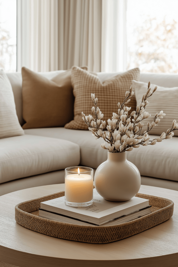 This approach works beautifully because the tray acts as a visual anchor for the styling. Instead of individual objects feeling scattered across the table, the tray gathers them into one intentional vignette. The woven texture also adds subtle depth, making the arrangement feel tactile and inviting without overwhelming the neutral palette often seen in coffee table decor ideas for spring.