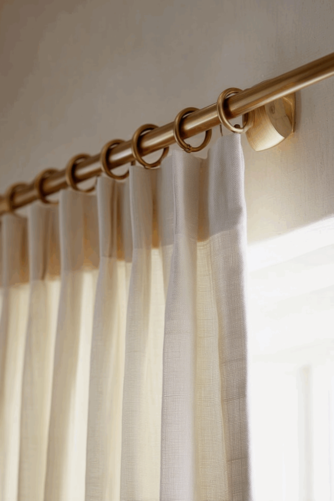 Opt for simple, minimal hardware that allows your natural drapes to shine. Hidden curtain rods create a seamless, built-in feel, while wooden rods, brass, or matte black finishes provide just enough contrast without overpowering the room’s serenity.