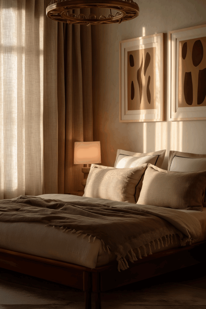 Opt for long, flowing curtain panels that skim the floor and draw the eye upward. Mounting your rods closer to the ceiling or stretching them wall-to-wall creates a sense of height and spaciousness. Choose airy, light-filtering fabrics like linen or cotton blends to allow in that golden glow while maintaining a sense of intimacy.