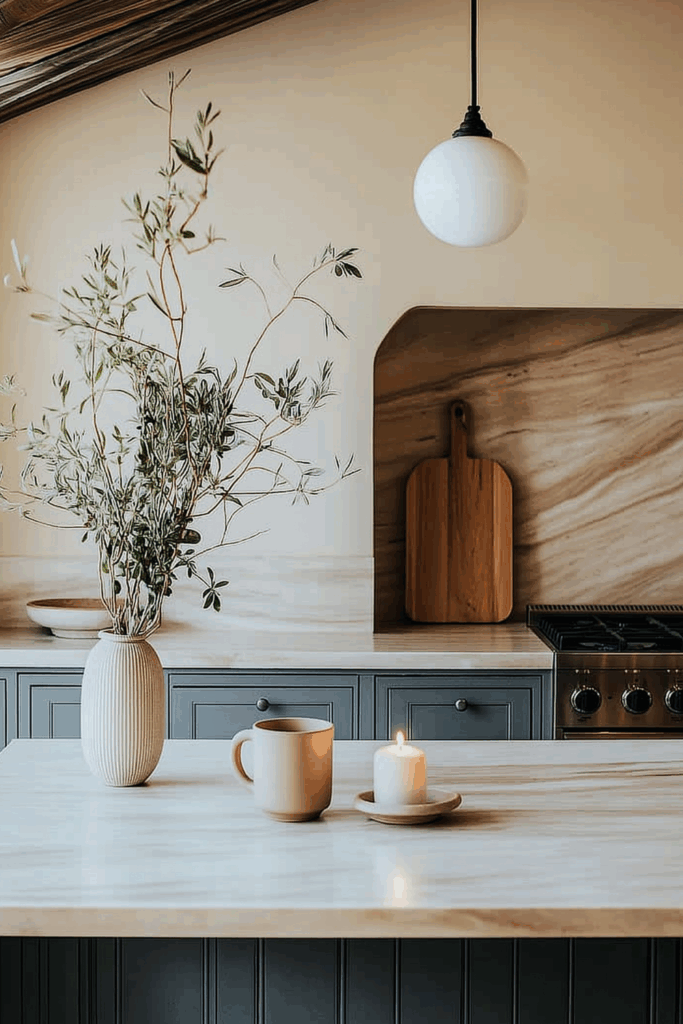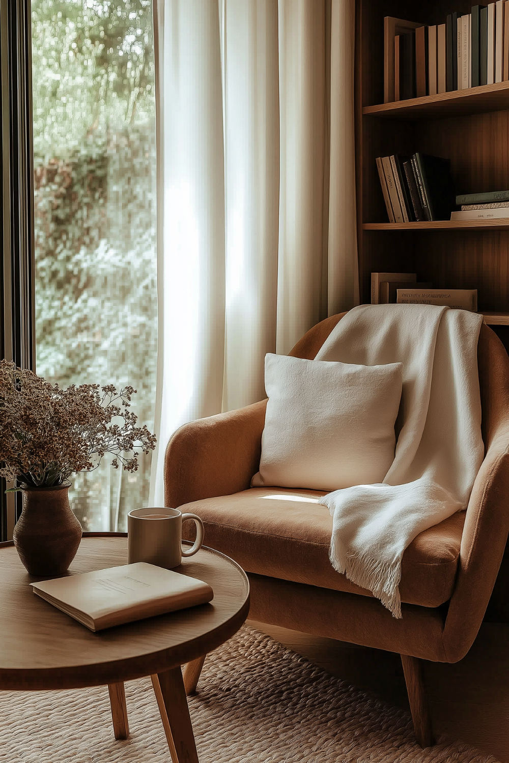 Start by creating a little breathing space around you. Clear off surfaces, soften the visual noise, and allow your eyes to rest. Choose natural materials like wood, stone, and linen to bring in grounding texture, and keep your color palette calm with soft neutrals and warm earth tones.