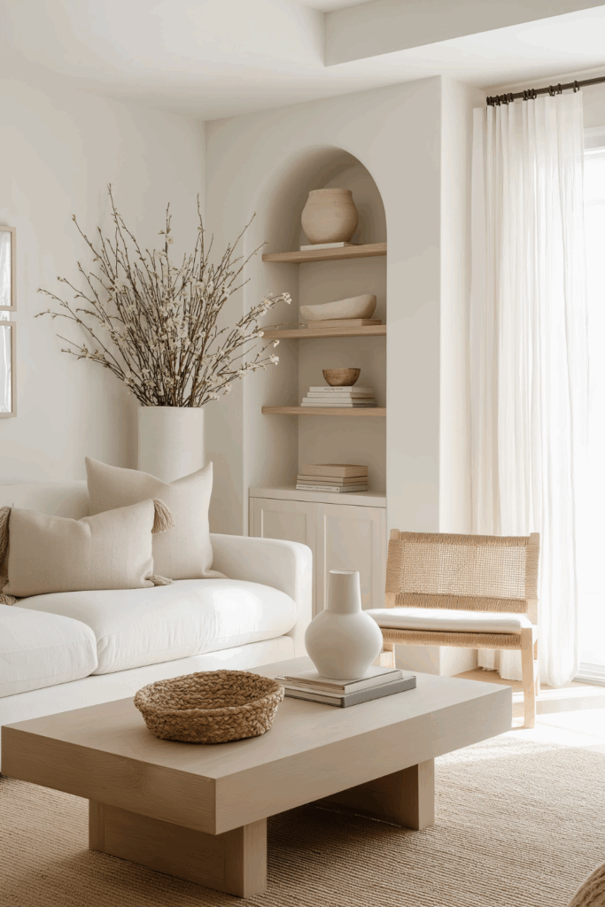 - Accents: upholstered furniture, curtains, or ceramics in warm beige