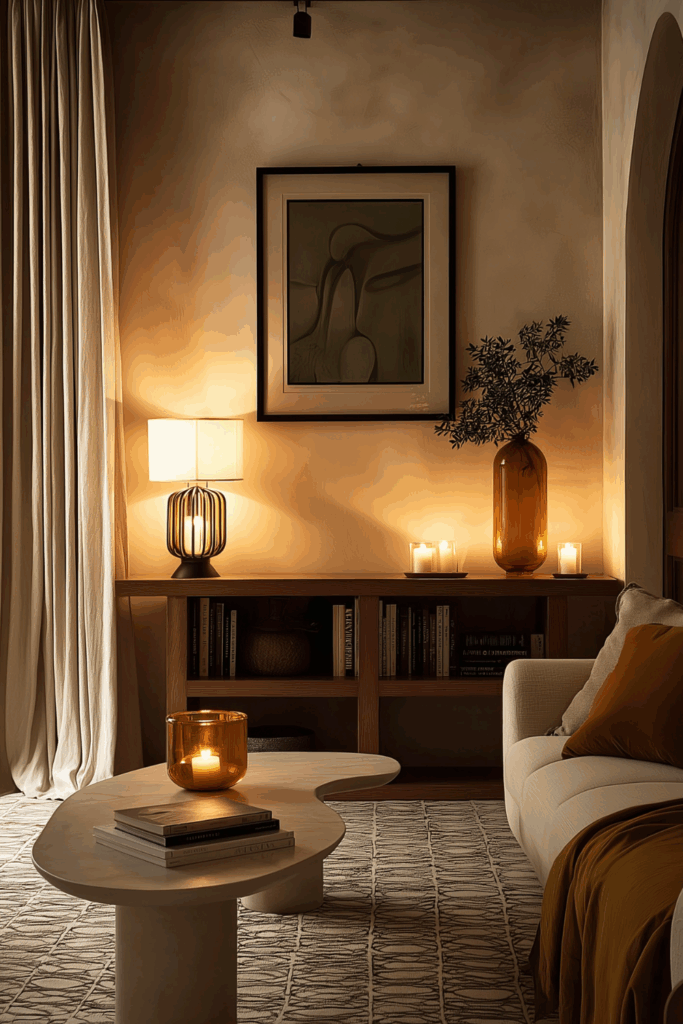 Style Tip: Layer your light sources at different heights to create a natural, welcoming flow. Pair an amber glass table lamp with candles or a lantern nearby to give the room depth and movement without overwhelming it.